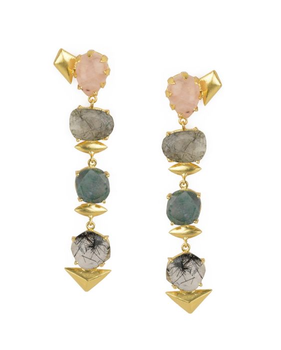 18k Micro Gold Plated Golden Earrings with Pink Moon Black Rutile Labradorite and Black Rutile Stones