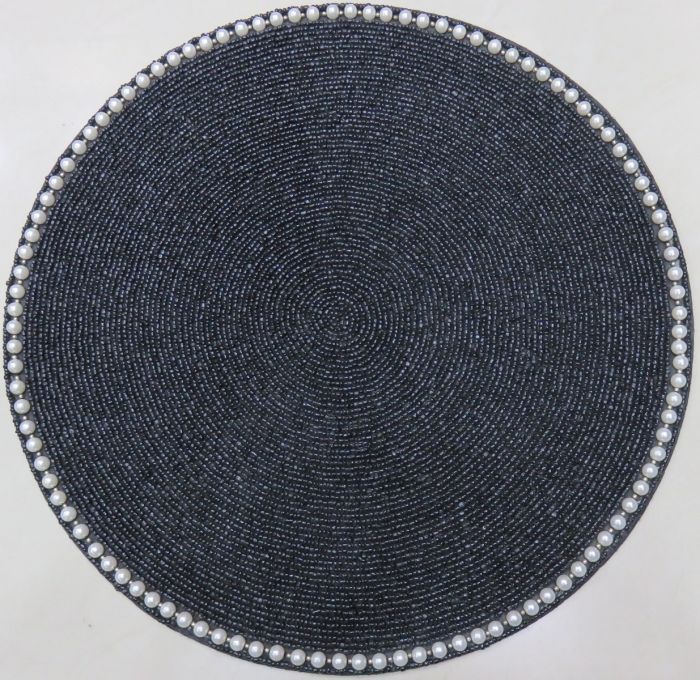 15" pearl beaded border placemat made of top plastic or glass beads and bback satin fabric.